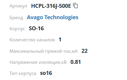 Опто драйвер IGBT [SO-16W], одноканальный оптодрайвер затвора с интегрированной функцией обнаружения насыщения (VCE) и обратной связью о неисправности, предназначенный для управления IGBT/MOSFET транзисторами. Этот компонент широко используется в промышленной электронике, электромобилях и инверторах