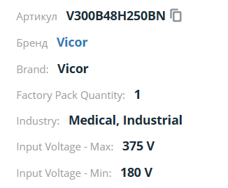 преобразователь, Isolated DC/DC Converters - Through Hole H 180375300 48V5.21A